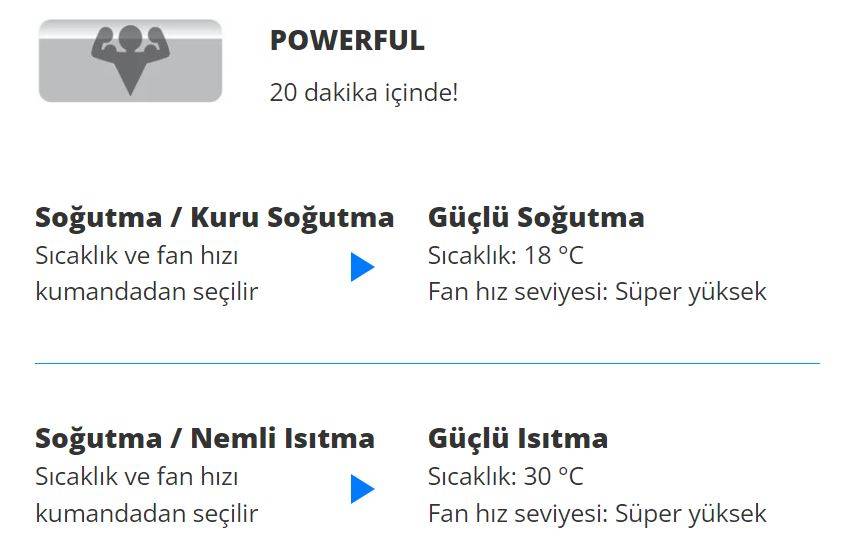 Tek bir tuşla daha güçlü performans sağlar. Odayı hızla soğutur ya da ısıtır. 20 dakika sonra önceki ayarlarına geri döner.