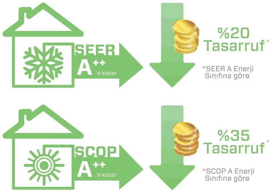 Güncel teknoloji ve akıllı sistem sayesinde soğutmada A+++ ve ısıtmada A++’ya ulaşan sezonsal verimlilik değerleri