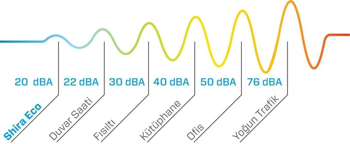 Shira Eco 20 dBA‘ya kadar düşebilen ses seviyesi ve 5 farklı fan kademesi sayesinde size maksimum konfor sunar.