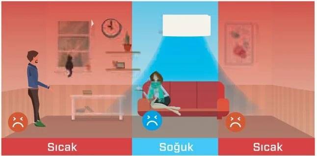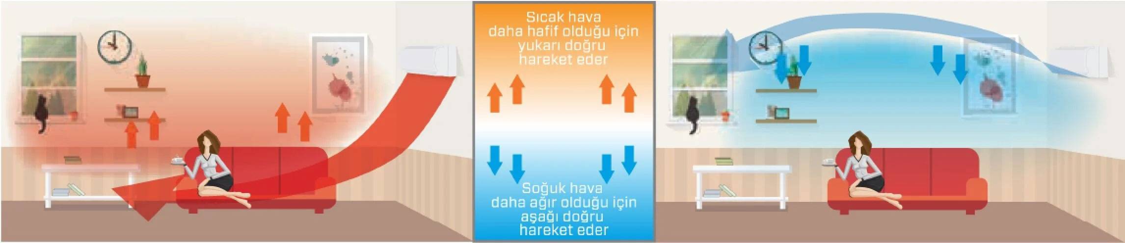 Hava, soğutma sırasında yukarıya, ısıtma sırasında aşağı doğru üflenir. Böylece havanın doğal hareketinden yararlanılarak eşit sıcaklık elde edilir.