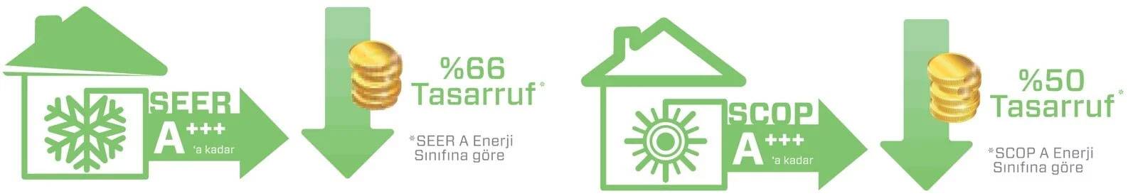 Güncel teknoloji ve akıllı sistem sayesinde soğutmada A+++ ve ısıtmada A++’ya ulaşan sezonsal verimlilik değerleri
